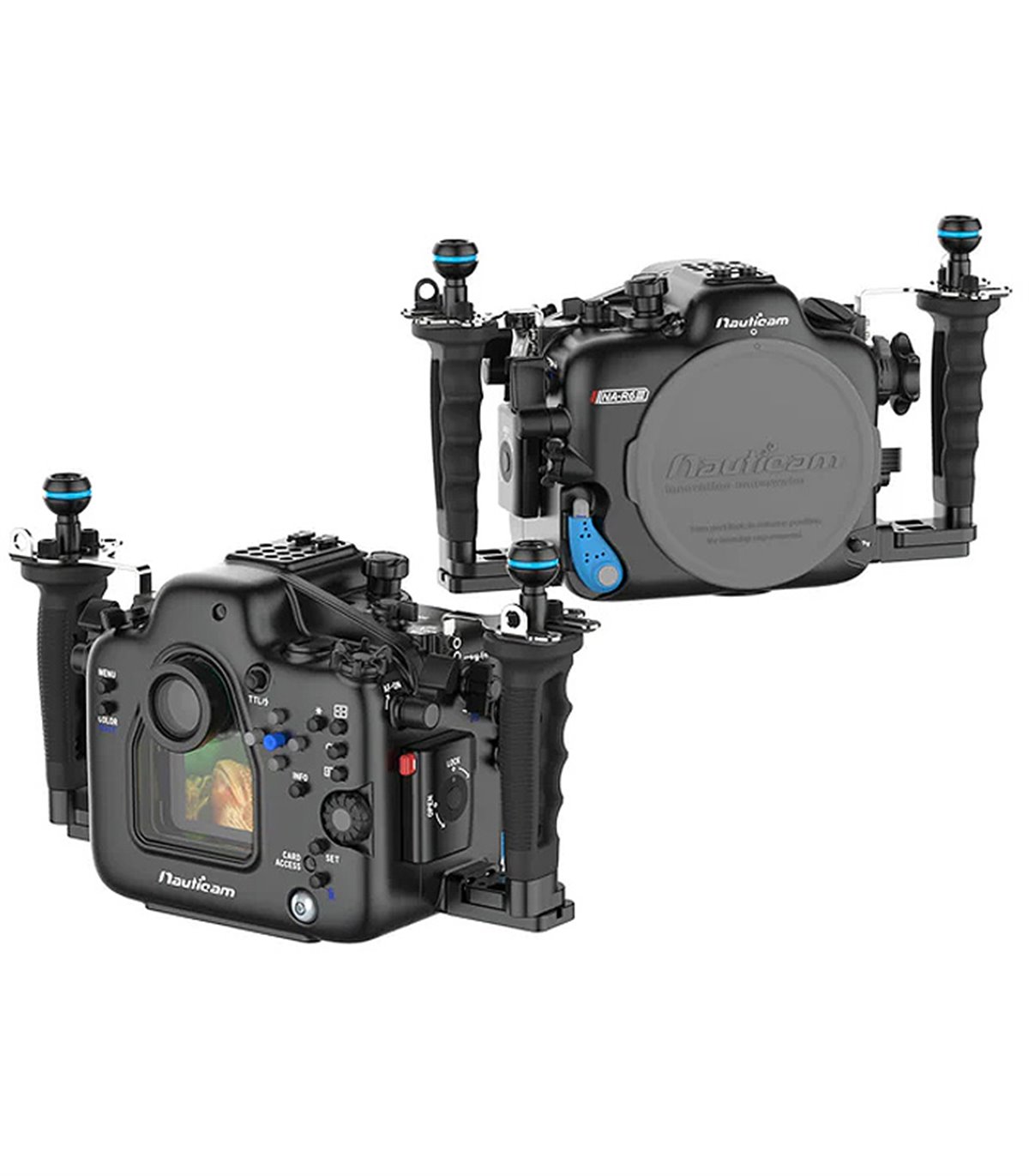 El NA-R6III materializa el compromiso de Nauticam con la innovación. Los controles esenciales son convenientemente accesibles sin necesidad de retirar las manos de los mangos ergonómicos. El N120 port lock II, el Rotary housing lock (bloqueo giratorio de la caja), y la palanca dedicada RF mount Lens REL (liberación de la lente con montura RF) facilitan una configuración eficiente que optimiza el tiempo de permanencia en el agua y minimiza el tiempo dedicado al mantenimiento del equipo. El sistema de puertos N120 es compatible con lentes de montura Canon RF y EF. La amplia gama de puertos de Nauticam y la óptica correctora interna complementan las capacidades de la NA-R6III. Cuando está equipado con una válvula de vacío accesoria, el sistema integrado de control de vacío y detección de fugas proporciona actualizaciones continuas sobre la integridad estanca de la caja. Un interruptor de reinicio del sistema de vacío, situado debajo de la bandeja, elimina la necesidad de abrir la parte trasera de la caja durante los cambios de lente o puerto. El NA-R6III está preparado para la personalización para satisfacer tus requisitos específicos de fotografía, incluyendo visores de Full Frame opcionales para una visualización mejorada, disparo de flashes óptico y electrónico, y soporte para monitores HDMI 2.0 y 1.4. El NA-R5III es capaz de soportar montaje adicional con orificios de $1/4-20$, M10 y M5 en la superficie superior de la caja para monitores e iluminación, mientras que la parte inferior acepta el set de bola de montaje de trípode 25218.