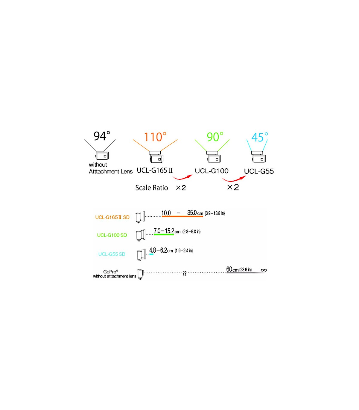 La distancia mínima de enfoque con las cámaras de acción GoPro es de 60 cm-∞ por lo que no se pueden usar para tomas macro submarinas ya que no permite enfocar. Con la lente UCL-G100 ZD diseñada específicamente para cámaras de acción, se reduce esa distancia mínima de enfoque bajo el agua a tan solo 7 cm y un máximo de 15,2 cm donde nos moveríamos en esas distancias de trabajo para espectaculares tomas cercanas con un ángulo de visión de 90º.