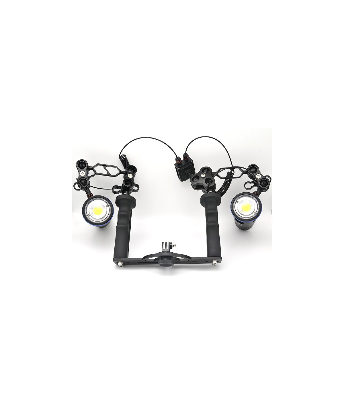 Set de 11200 Lúmenes para cámaras de acción compuesto por dos focos Scubalamp V3Kv3 con control remoto, base con doble mango y brazos