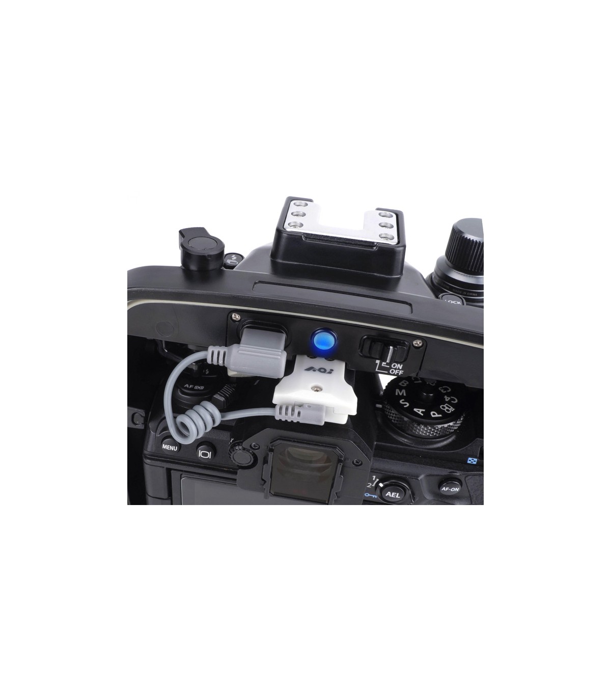 The housing includes an internal LED trigger with connection to the camera's hot shoe to trigger external strobes with fiber optic cables, thus extending the working time of the camera and increasing the firing speed of our strobes. Compatible in Manual mode and Olympus RC mode (TTL AUTO, MANUAL, FP TTL AUTO, FP MANUAL).