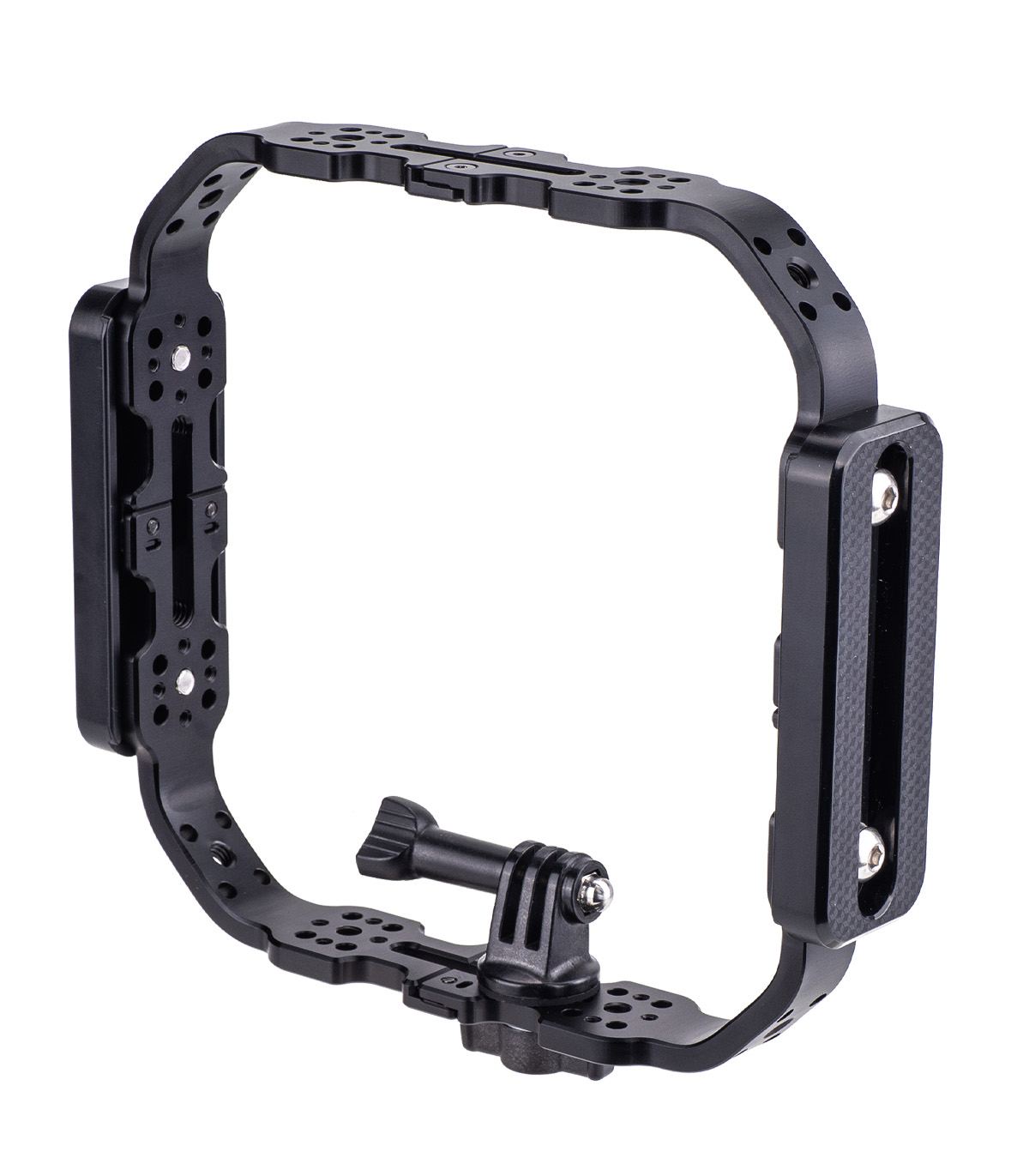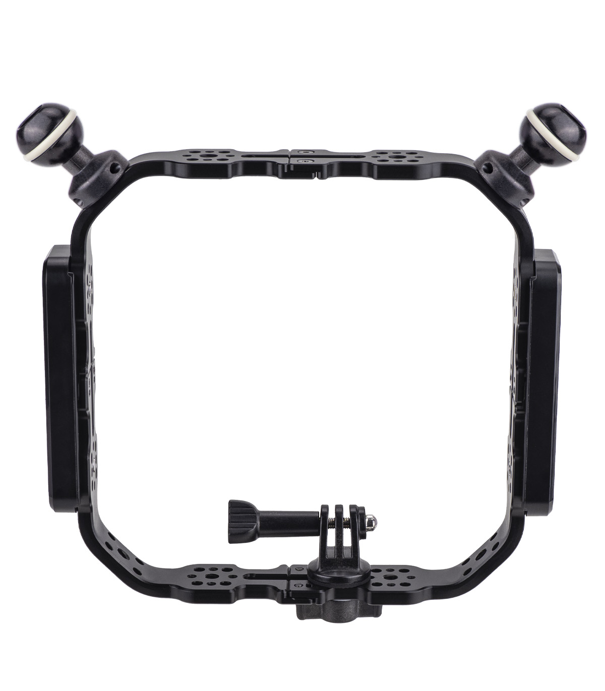 The aluminum-made base includes two plastic side grips, two 1" ball mounts for accessories on the top, and a detachable GoPro-style action camera mount with a tripod screw thread at the base.
