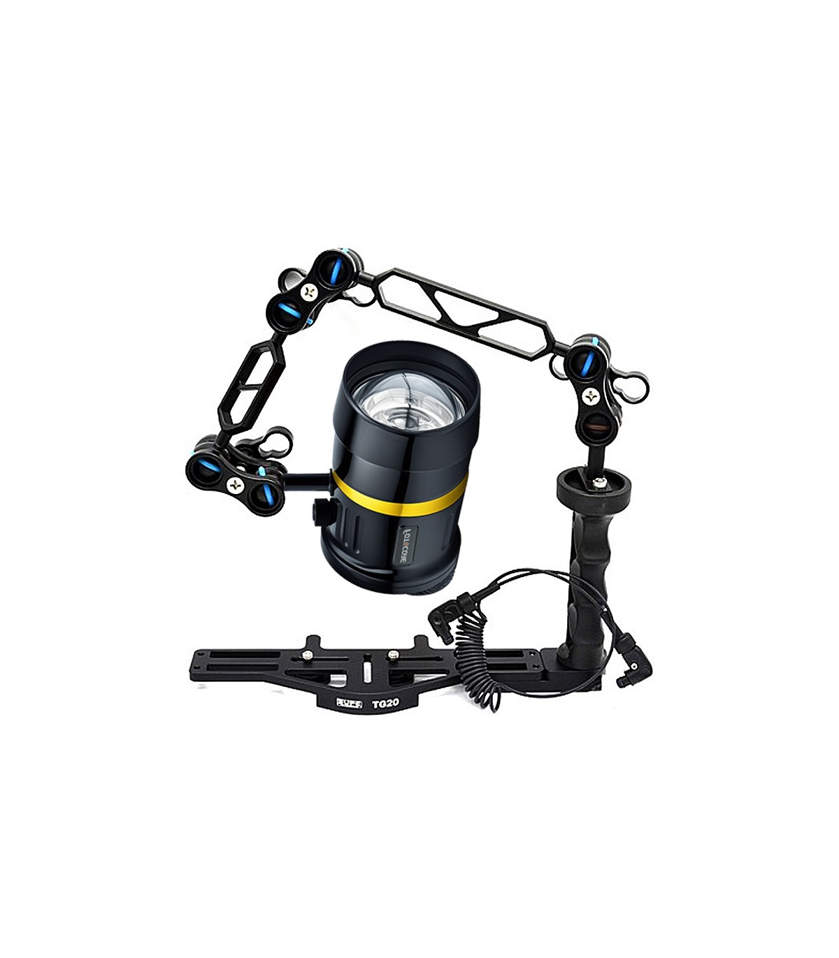 The set includes a tray with one handle (expandable to 2 handles) adjustable to different housing widths with one or two tripod screws, three clamps, arms combination to choose between 8 "(20cm) + 6" (15cm) or 6 "(15cm) + 4" (10cm), one Fotocore GTM strobe in black colour and fiber optic cable with Sea&Sea connectors.