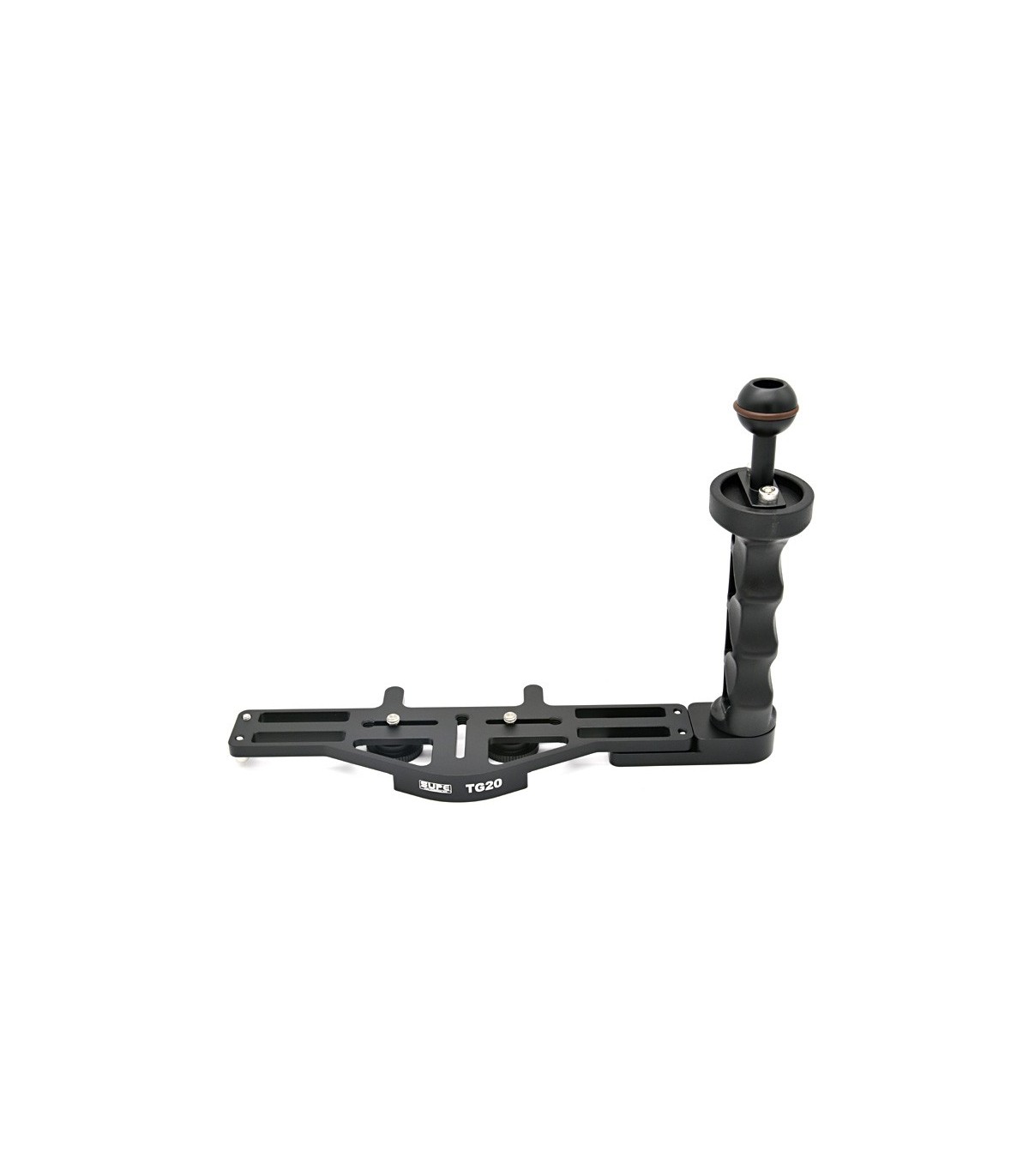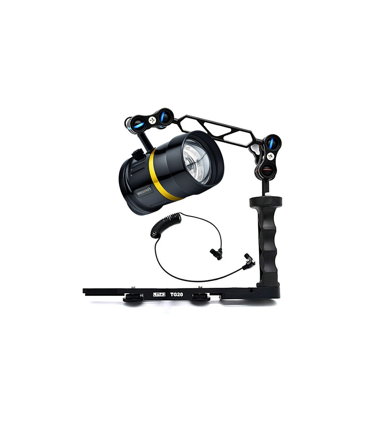 The set includes a tray with one handle (expandable to 2 handles) adjustable to different housing widths with one or two tripod screws, two clamps, one arm to choose between 8 "(20cm), 6" (15cm) and 4" (10cm), one Fotocore GTM strobe in black colour and fiber optic cable with Sea&Sea connectors.